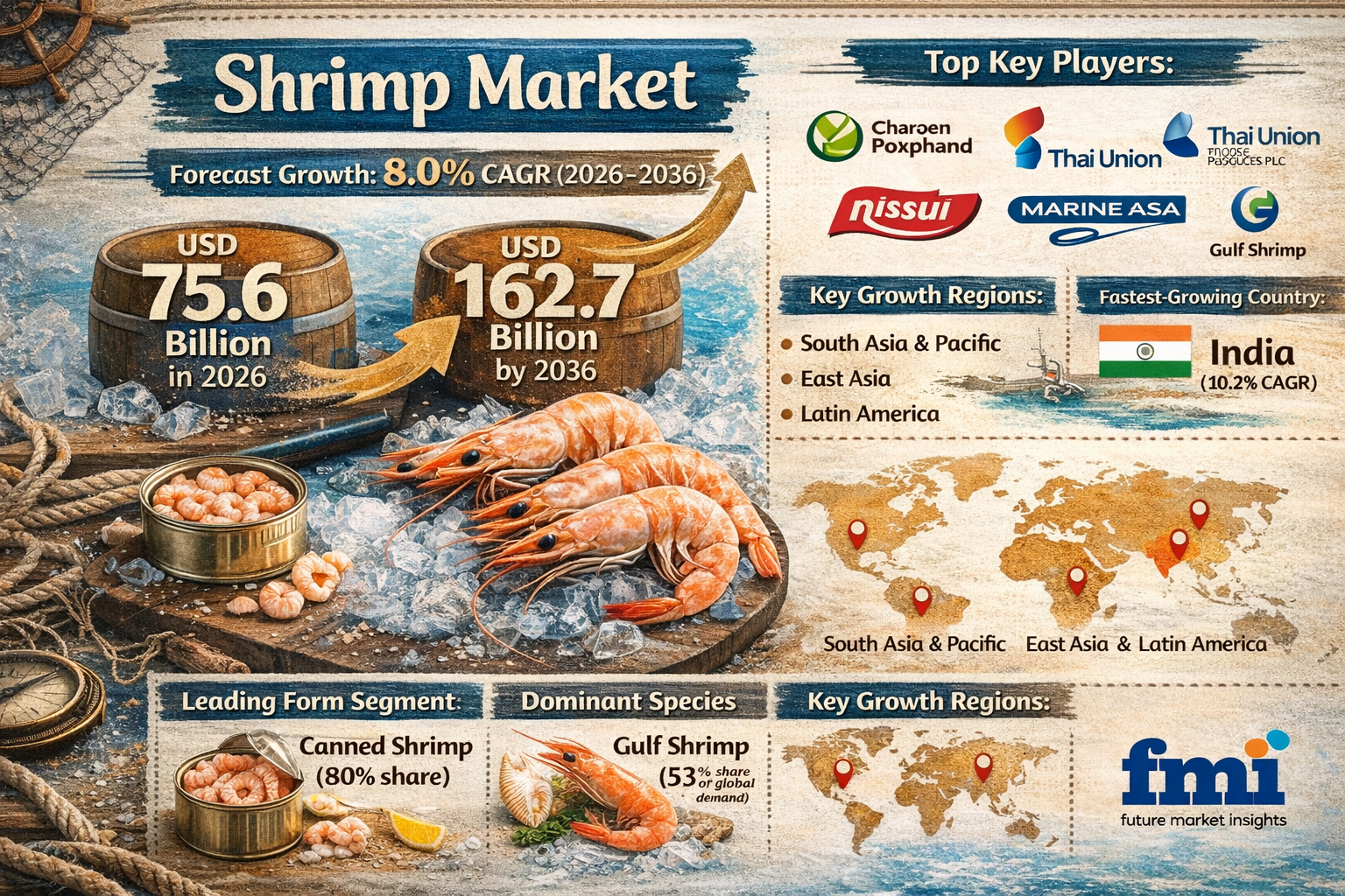 February 11, 2026 –The global shrimp market is witnessing unprecedented growth, driven by rising consumer demand for high-protein seafood, expanding aquaculture capacities, and an increasing appetite for processed and value-added shrimp products across retail and foodservice sectors. Valued at USD 75.6 billion in 2026, the market is projected to reach USD 162.7 billion by 2036, registering a robust compound annual growth rate (CAGR) of 8.0% over the forecast period.